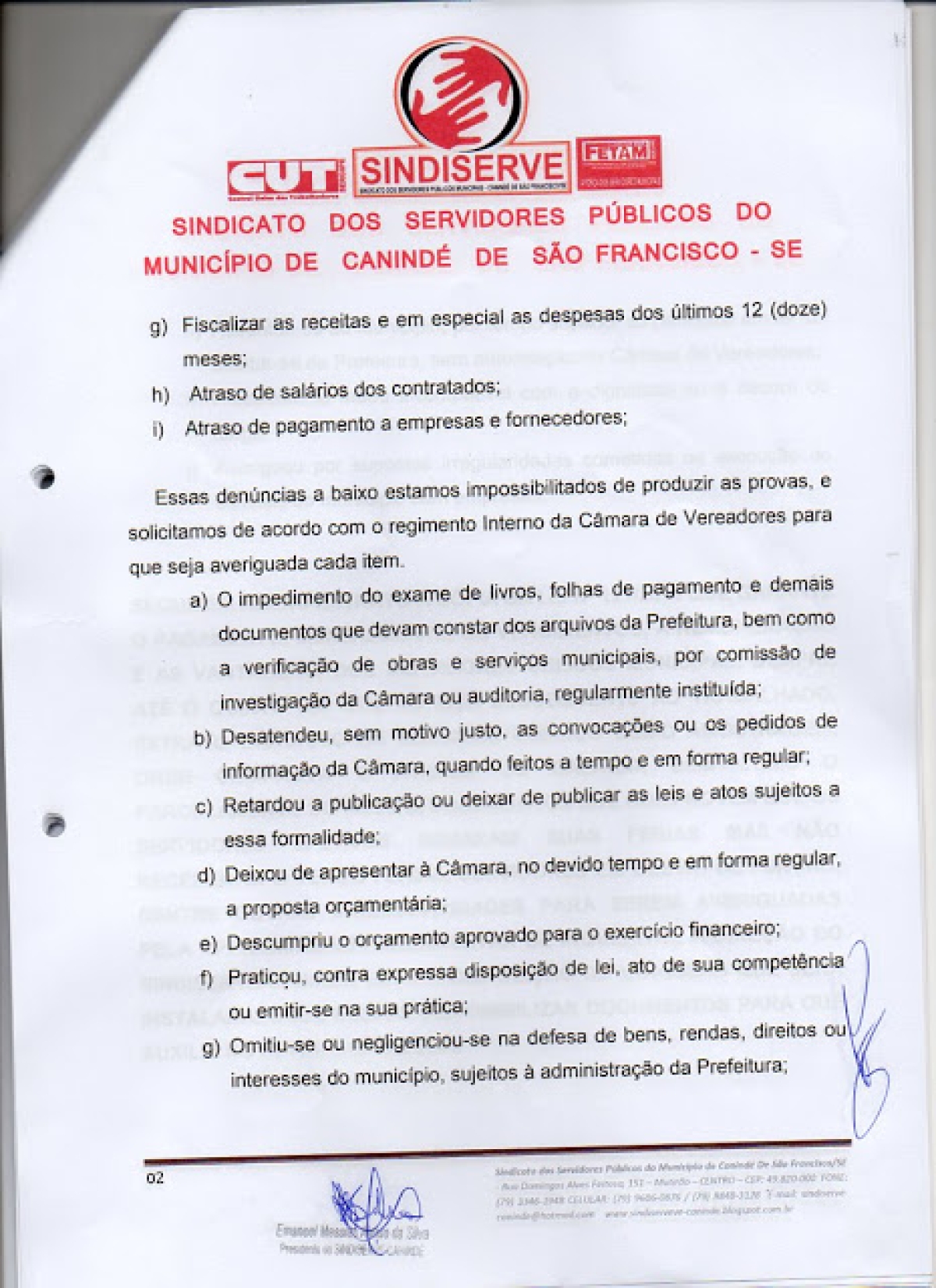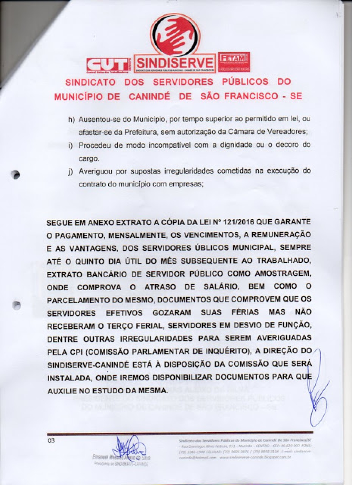 VEJA ABAIXO O DOCUMENTO NA ÍNTEGRA QUE O SINDISERVE-CANINDÉ PROTOCOLOU PEDINDO A CONSTITUIÇÃO DA CPI PARA QUE SEJA AVERIGUADA AS IRREGULARIDADES E ENTÃO OS VEREADORES CASSAREM O MANDATO DO PREFEITO HELENO SILVA: