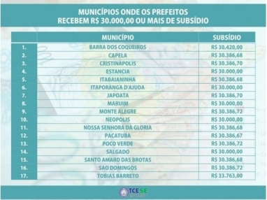 Prefeitos de pelo menos dezessete municípios recebem R$ 30 mil; confira cidades