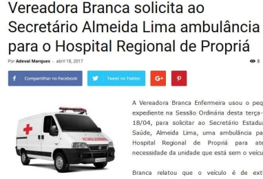 Vereadora Branca solicita ao Secretário Almeida Lima ambulância para o Hospital Regional de Propriá
