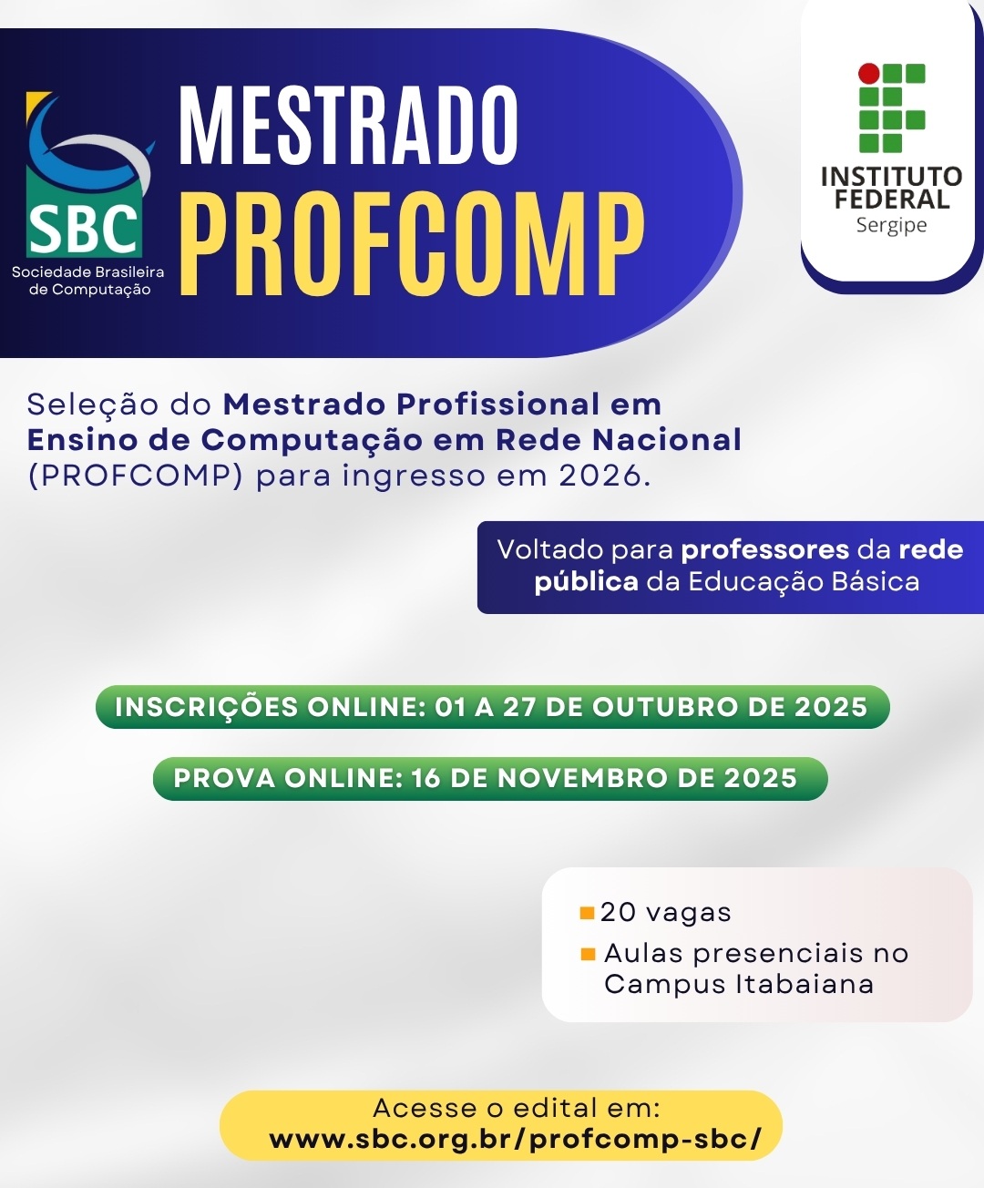 MESTRADO PROFCOMP Post para Instagram 45O Instituto Federal de Sergipe (IFS) está com inscrições abertas para o processo seletivo do Mestrado Profissional em Ensino de Computação (PROFCOMP), programa em rede nacional que oferece 20 vagas no campus Itabaiana. A iniciativa é coordenada pela Sociedade Brasileira de Computação (SBC), em parceria com 16 instituições de ensino superior de todo o Brasil.