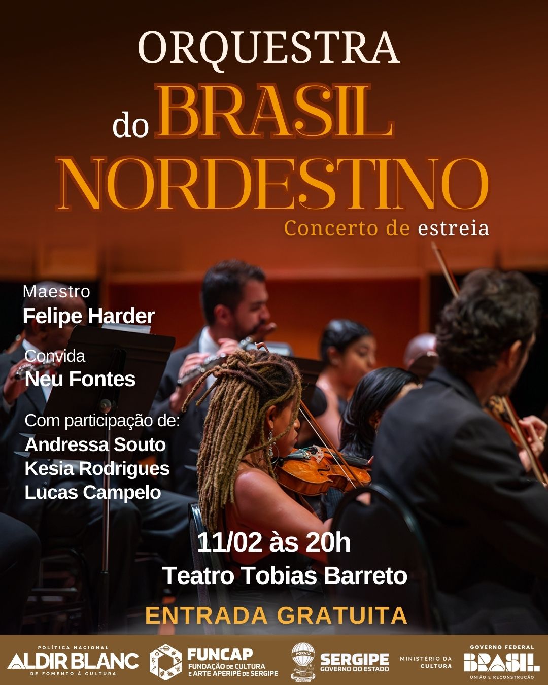 Orquestra do Brasil Nordestino estreia com concerto gratuito no Teatro Tobias BarretoNo dia 11 de fevereiro, às 20h, o Teatro Tobias Barreto abre as portas para o concerto de estreia da Orquestra do Brasil Nordestino, novo grupo sinfônico sergipano criado para celebrar e projetar a cultura nordestina nos palcos do país. A apresentação será gratuita e marca o início da trajetória da orquestra, que já tem circulação prevista em estados como São Paulo, Bahia e Alagoas.