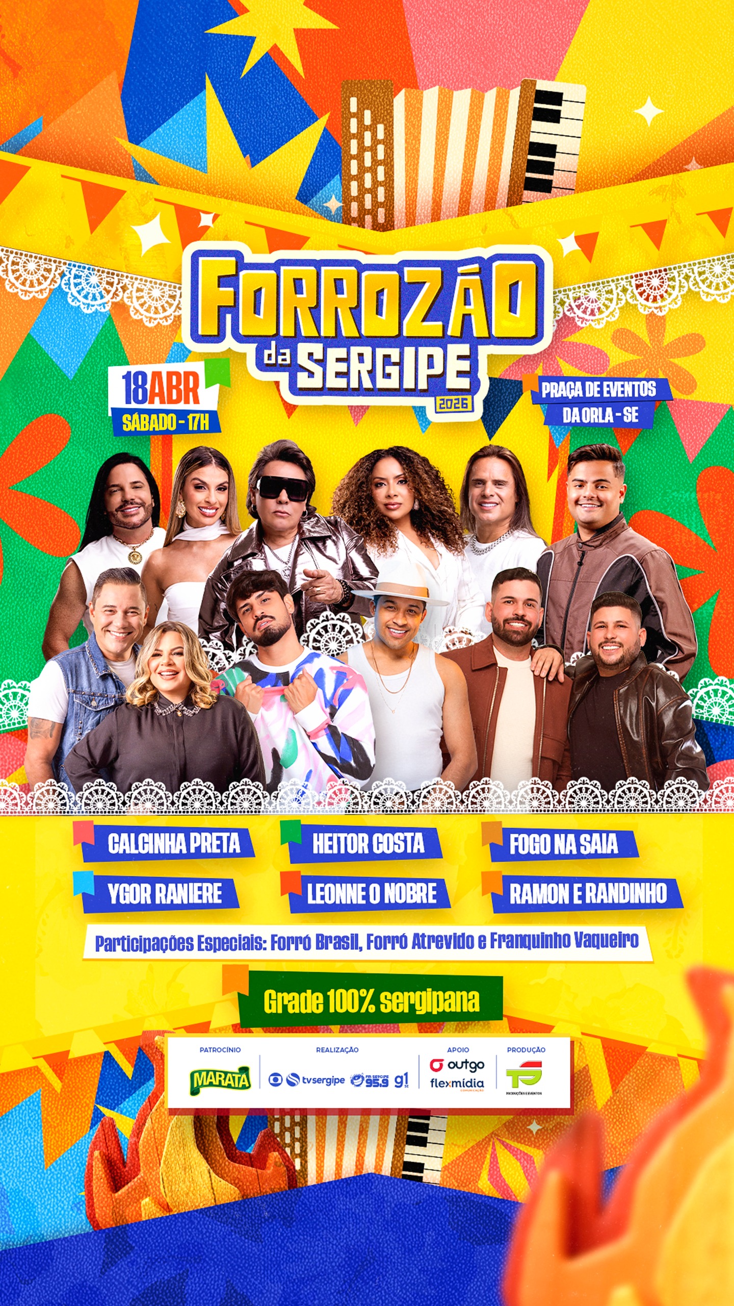 A edição de 2026 do tradicional Forrozão vai abrir oficialmente os festejos juninos de Sergipe neste sábado, 18 de abril, à partir das 17h na Praça de Eventos da Orla da Atalaia, em Aracaju. O evento é uma realização da TV Sergipe, FM Sergipe e G1 com organização da TS Produções e assessoria de Imprensa da Navarro Comunicação.