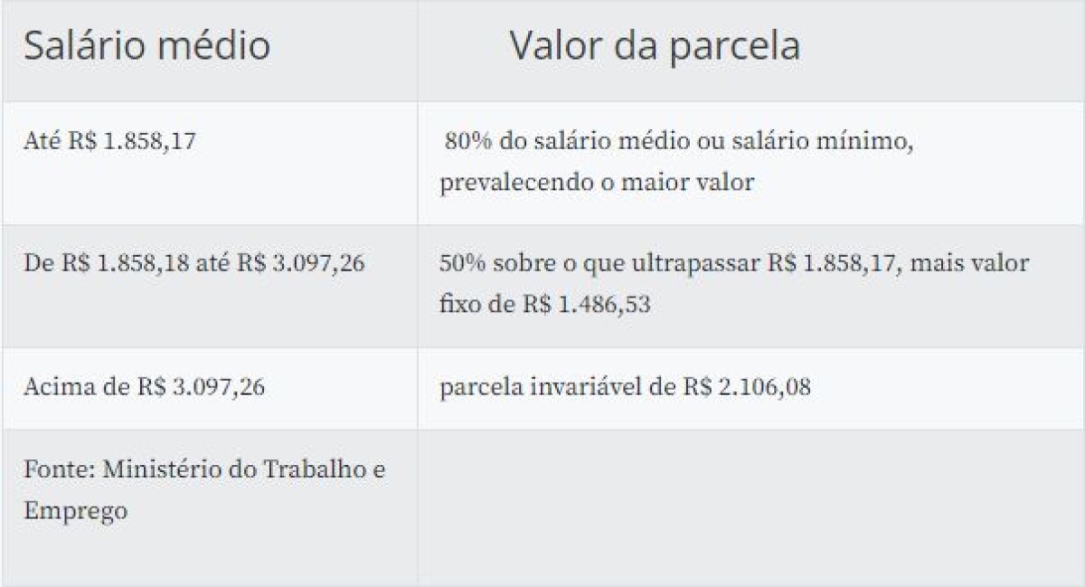 A parcela do seguro-desemprego é calculada com base na média das três últimas remunerações do trabalhador antes da demissão. Após a correção das faixas salariais, o benefício será definido da seguinte forma.