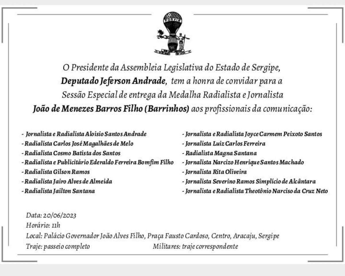 Na manhã desta terça-feira, 20, a Assembleia Legislativa de Sergipe realizará a cerimônia para entrega da Medalha Radialista e Jornalista João de Menezes Barros Filho (Barrinhos). Entre os homenageados está o Radialista e professor Jairo Alves de Almeida, por indicação do deputado estadual Georgeo Passos (Cidadania).