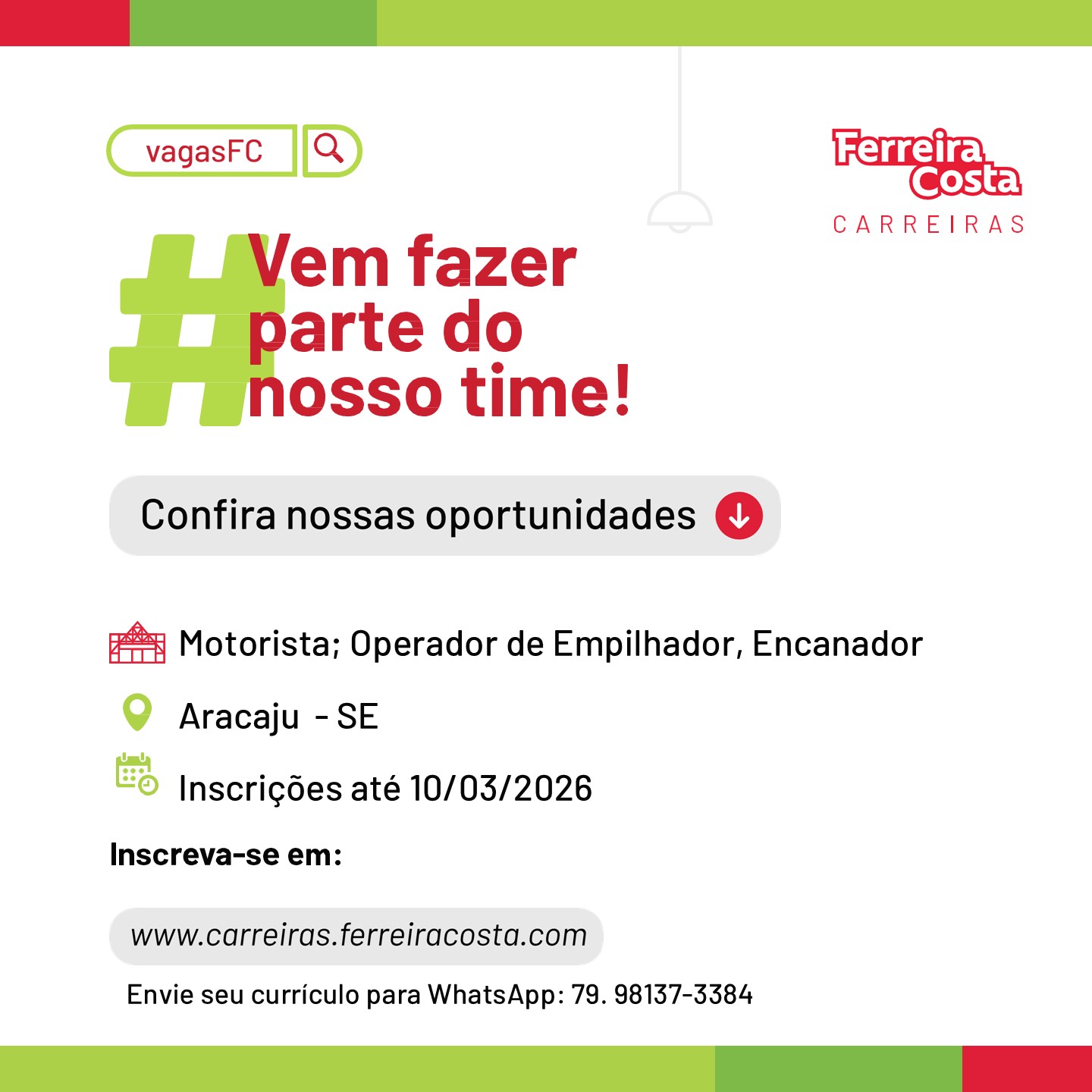 A Ferreira Costa, referência no setor de home center, está com processo seletivo aberto para a contratação de 30 novos colaboradores para integrar o time de sua unidade em Aracaju. As vagas disponíveis são destinadas aos cargos de motorista, operador de empilhadeira e encanador, buscando profissionais que desejam atuar em uma estrutura robusta e dinâmica. A unidade está estrategicamente localizada na Avenida Presidente Tancredo Neves, número 2695, no bairro Inácio Barbosa, e as contratações visam reforçar o suporte logístico e operacional da loja para garantir a excelência no atendimento e na manutenção das atividades.