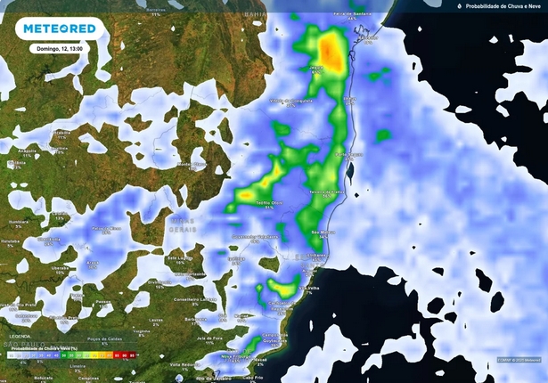 No domingo (12) as chuvas se mantêm na faixa leste do Espírito Santo e alcançam grande parte do território baiano, desde o sul até Salvador, onde podem ter intensidade moderada a forte em alguns momentos, mesmo que no geral as chuvas devem ser menos intensas que sábado.