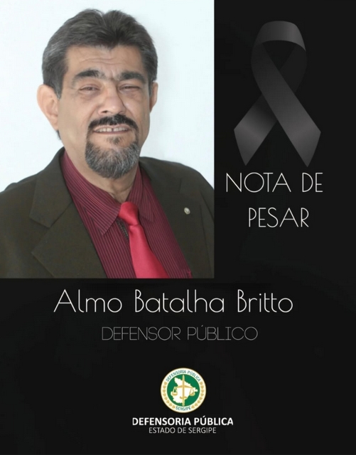 A Defensoria Pública do Estado de Sergipe comunica o falecimento do defensor público, Almo Batalha Britto, 65 anos, ocorrido na tarde desta sexta-feira, 9, no Hospital Primavera, onde se encontrava internado desde a última terça-feira (6).