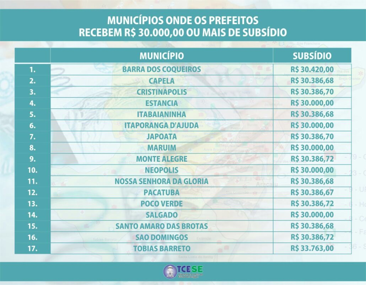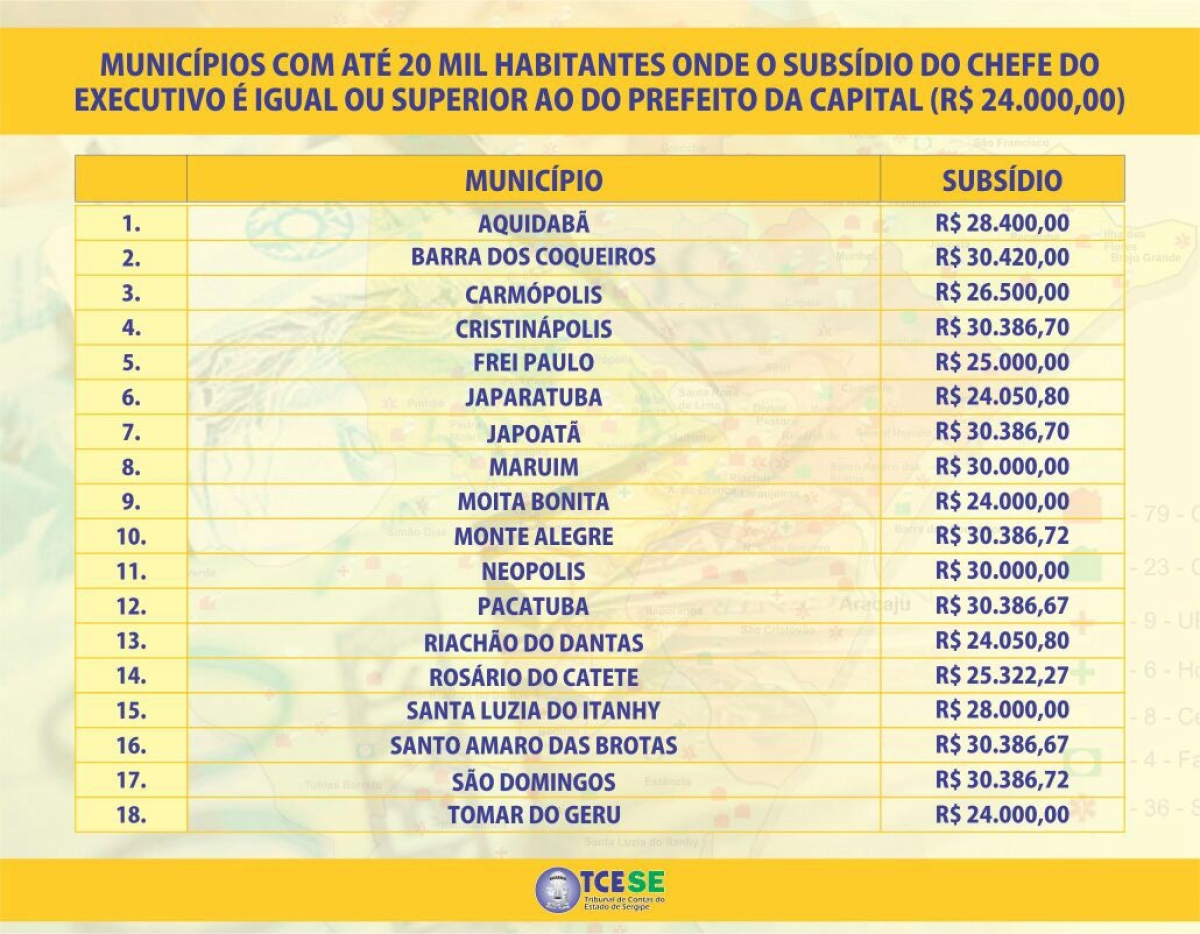 O levantamento flagrou 18 municípios com menos de 20 mil habitantes que pagam subsídios aos chefes dos executivos iguais ou superiores ao salário pago ao prefeito da capital, que hoje é de R$ 24 mil. Em alguns desses, os prefeitos recebem R$ 30 mil ou mais do que isso: Barra dos Coqueiros, Cristinápolis, Japoatã, Maruim, Monte Alegre, Neópolis, Pacatuba, Santo Amaro das Brotas e São Domingos.
