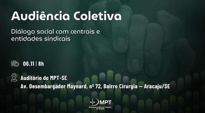 A audiência será aberta ao público e acontecerá no dia 06/11, no auditório do MPT-SE (Av. Desembargador Maynard, n. 72, Bairro Cirurgia – Aracaju), a partir das 8h.