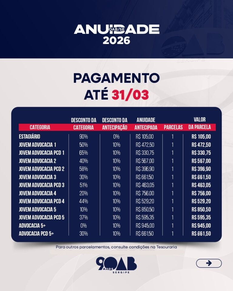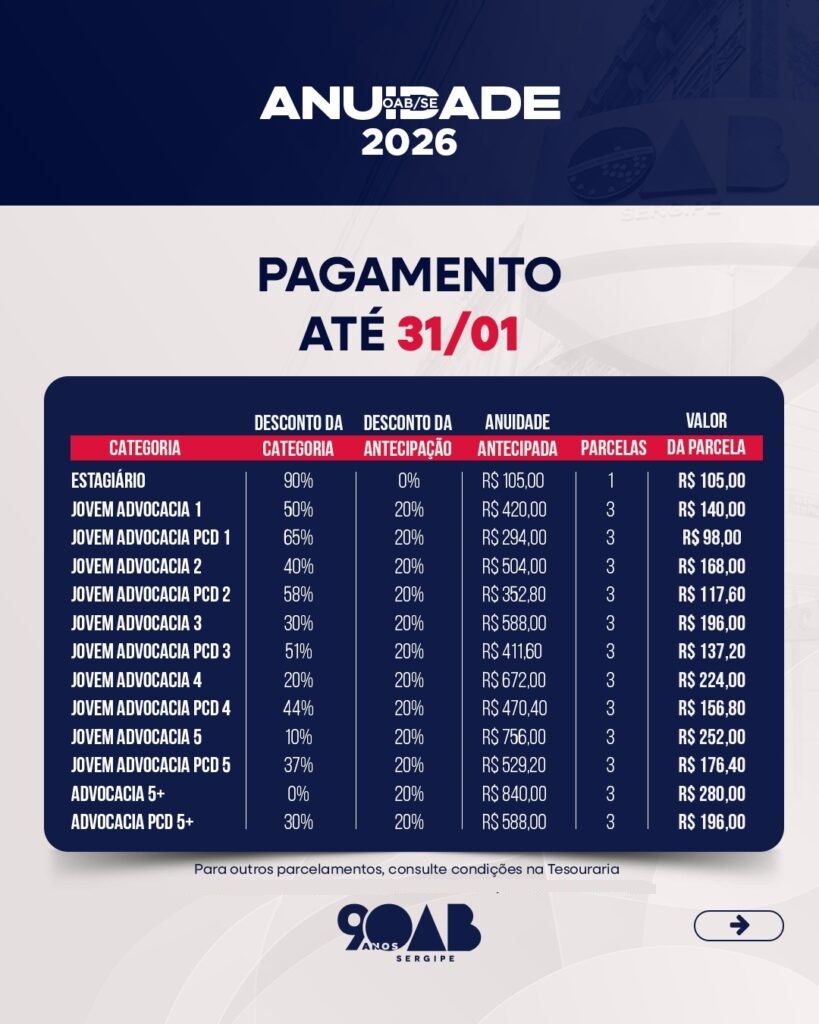 “A diretoria da OAB/SE ponderou que a prorrogação do prazo de adimplência até o dia 26 de janeiro seria razoável, permitindo que advogados e advogadas tenham mais tempo para se organizar e ficar em dia com a instituição. Assim, de forma excepcional, será garantido o acesso integral aos descontos da anuidade 2026 àqueles que regularizarem sua situação financeira até o dia 26 de janeiro”, explica o diretor-tesoureiro, Ismar Francisco.