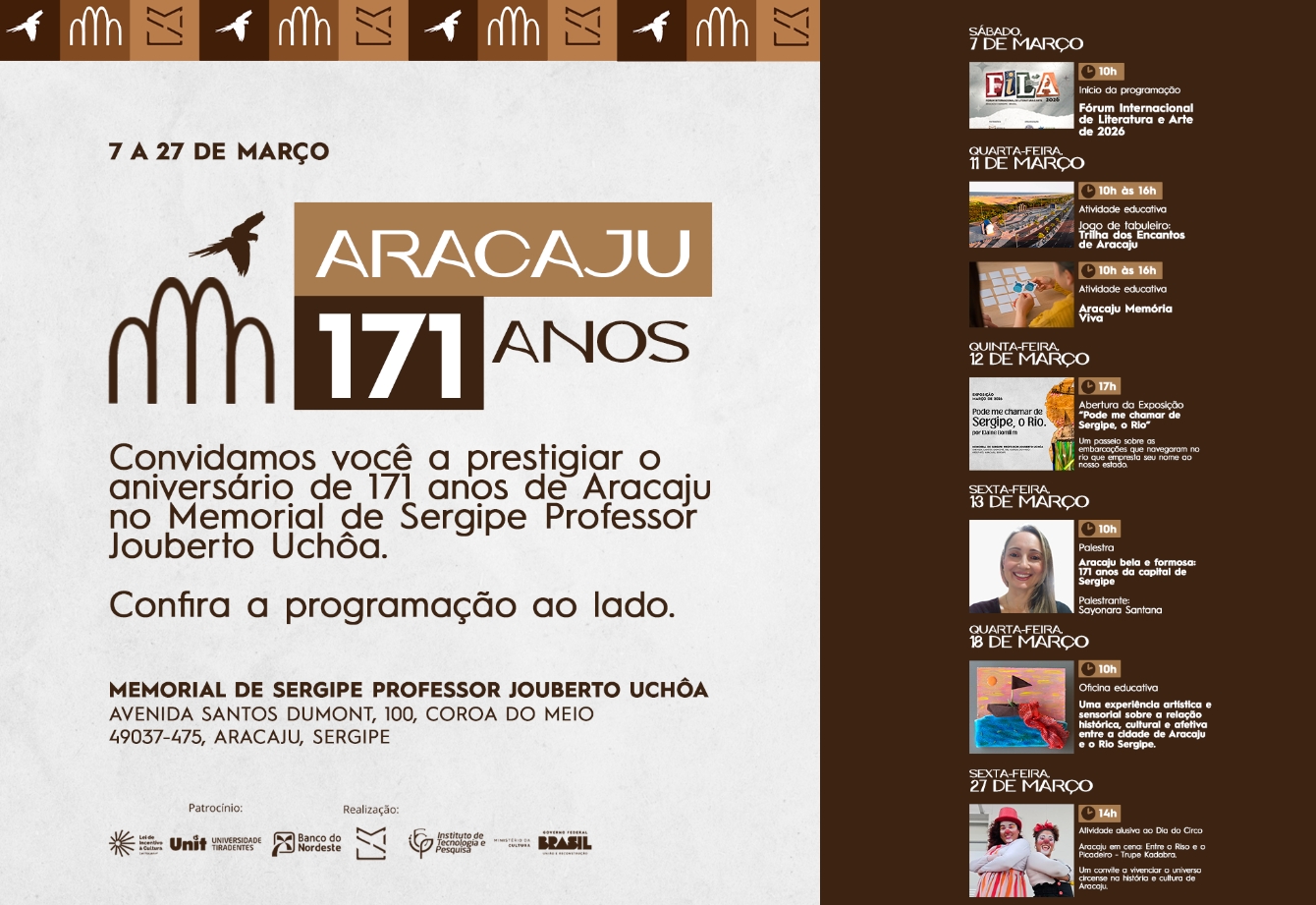 O Memorial de Sergipe Prof. Jouberto Uchôa promoverá, em alusão ao aniversário de 171 anos de Aracaju, celebrado no próximo dia 17 de março, uma especial programação cultural e educativa, com atividades que visam valorizar a história, a memória e a profunda relação da capital sergipana com o Rio Sergipe. Os eventos acontecerão entre os dias 7 a 27 nas instalações do Memorial e a entrada para a programação será gratuita.