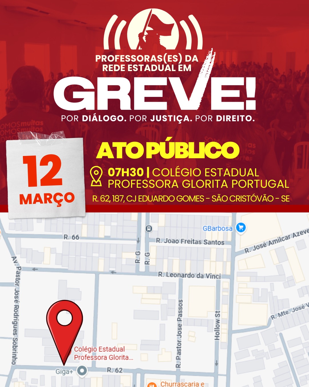 Nosso ato vai ser no Colégio Estadual Professora Glorita Portugal, localizado no conjunto Eduardo Gomes, logo após a UFS, em São Cristóvão, onde acontece a ação do governo ‘Sergipe é Aqui’. Estaremos por lá às 7h30.