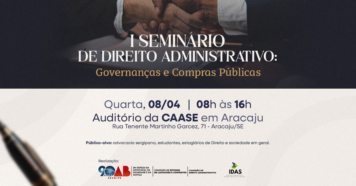 A Ordem dos Advogados do Brasil – Seccional Sergipe (OAB/SE) realizará, no dia 08 de abril, o I Seminário de Direito Administrativo: Governança e Compras Públicas, evento que trará a Sergipe especialistas de diversas áreas para discutir o aprimoramento da gestão pública.