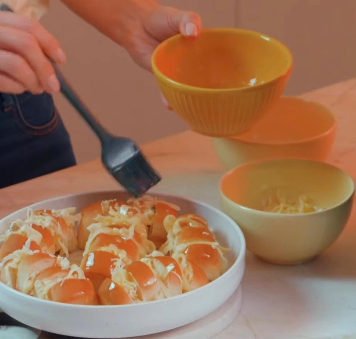 Pincele a manteiga restante no topo dos pães e polvilhe o queijo parmesão.