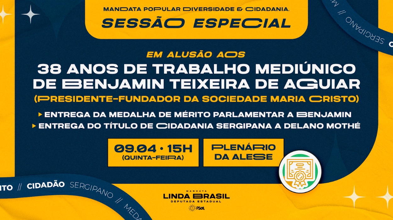A Assembleia Legislativa de Sergipe (Alese) realizará, na próxima quinta-feira (9), às 15h, uma Sessão Especial em homenagem aos 38 anos do trabalho mediúnico de Benjamin Teixeira de Aguiar. O orientador espiritual da Sociedade Maria Cristo, com a guia espiritual Eugênia-Aspásia, será homenageado na Casa Legislativa a partir de iniciativa de autoria da deputada Linda Brasil (Psol).