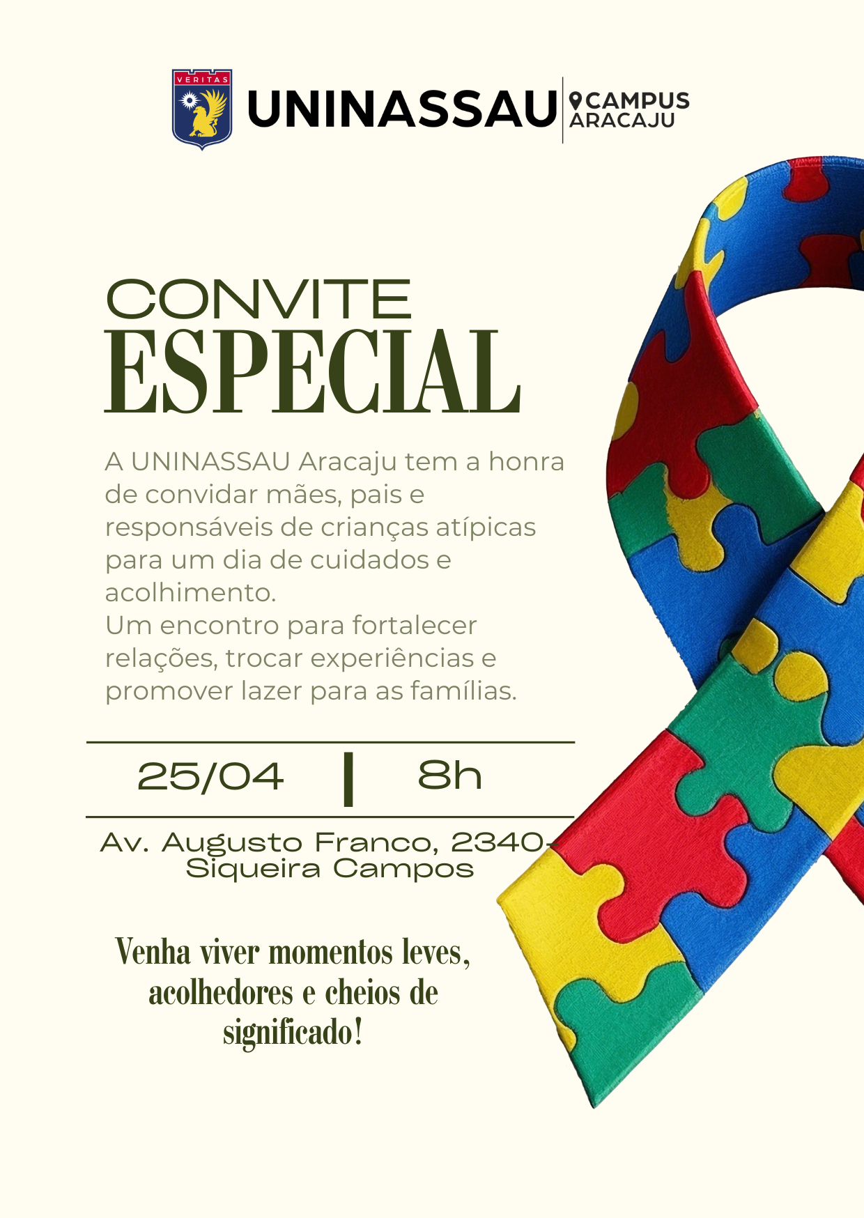 Em alusão ao mês de conscientização sobre o Transtorno do Espectro Autista (TEA), o UNINASSAU – Centro Universitário Maurício de Nassau Aracaju realiza, no próximo sábado (25), a ação social “Dia UNINASSAU: Cuidando de quem cuida”, voltada ao acolhimento de cuidadores e responsáveis por pessoas com TEA. O evento acontece das 8h às 12h, na própria Instituição, e é aberto ao público.