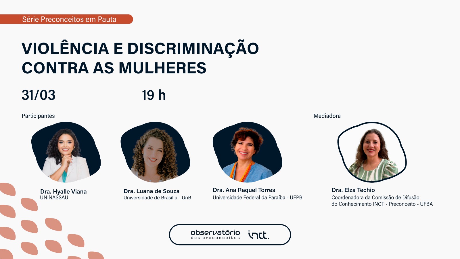 A mesa contará com a participação de três pesquisadoras de referência na Psicologia Social brasileira, que trarão perspectivas complementares sobre o tema. A professora Dra. Hyalle Abreu Viana, psicóloga clínica e docente da UNINASSAU, abordará a discriminação no mercado de trabalho. Já a professora Dra. Luana Elayne Cunha de Souza, da Universidade de Brasília e integrante do comitê gestor do INCT-Preconceitos, discutirá o assédio de rua. A professora Dra. Ana Raquel Rosas Torres, da Universidade Federal da Paraíba e coordenadora do INCT-Preconceitos, tratará do abuso psicológico.