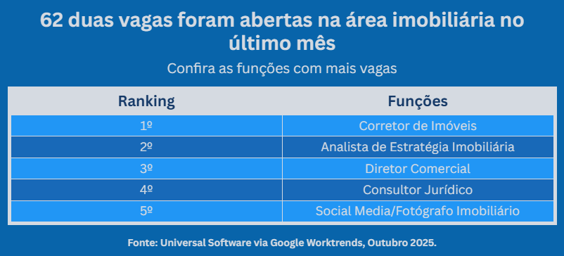 O Google WorkTrends identificou 62 vagas abertas na área imobiliária no último mês. Além do corretor de imóveis, surgem funções como analista de estratégia imobiliária, diretor comercial, consultor jurídico, social media e até fotógrafo imobiliário.