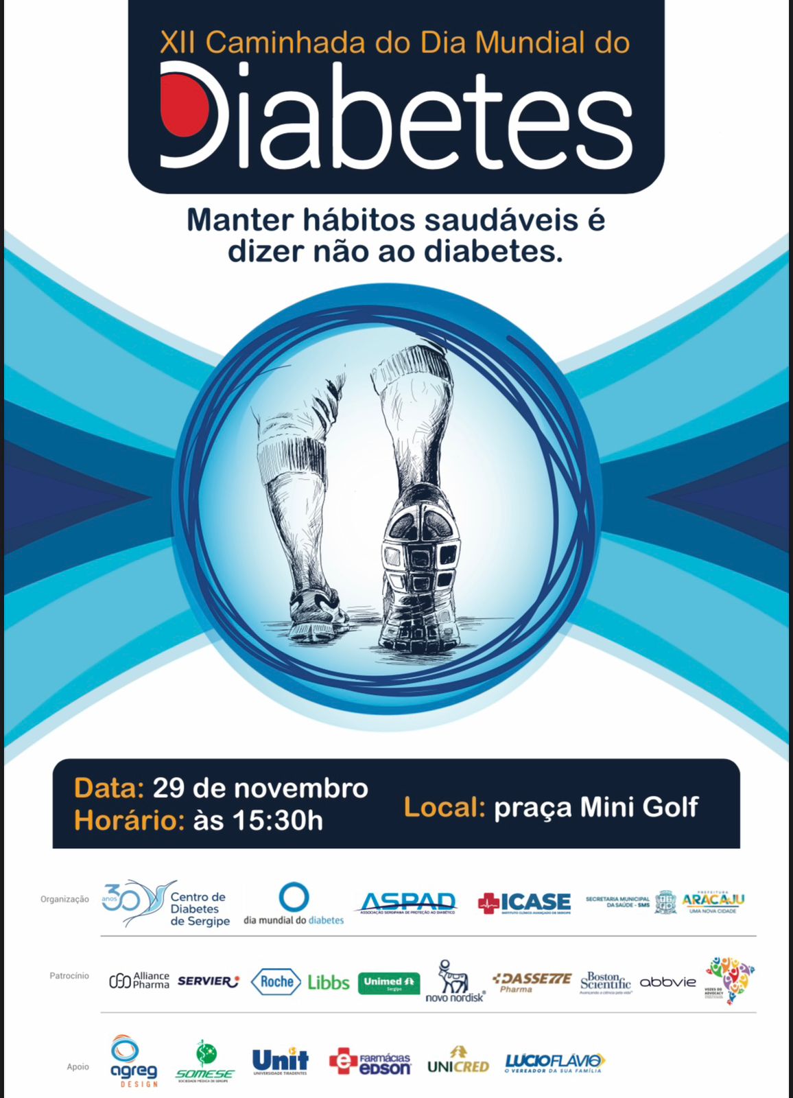 A Associação Sergipana de Proteção ao Diabético (ASPAD) realiza no dia 29 de novembro a 12ª Caminhada pelo Dia Mundial do Diabetes, ação tradicional no calendário de conscientização em Sergipe. A concentração será na Praça do Mini Golf, no bairro 13 de Julho, com percurso até o estacionamento externo do Parque da Sementeira.