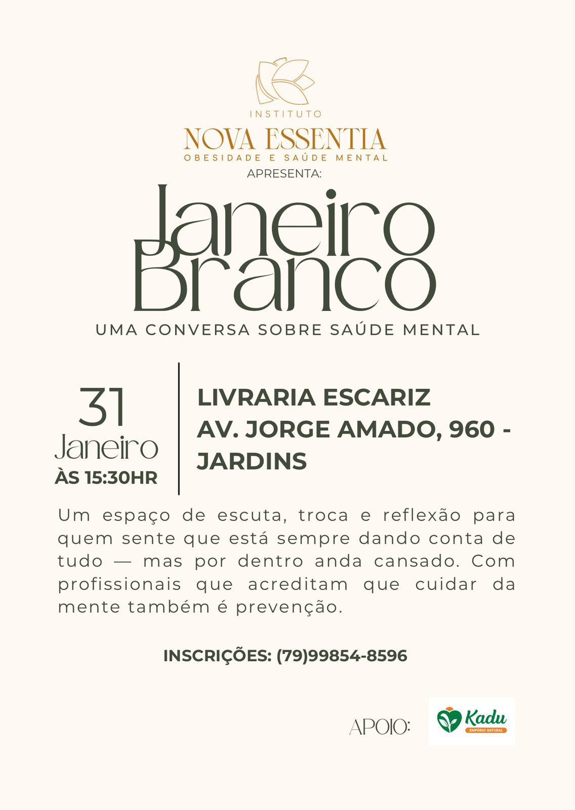 - O quê: Roda de conversa do Janeiro Branco — uma conversa aberta sobre saúde mental, promovida pelo Instituto Nova Essentia, com foco em escuta, troca e reflexão sobre o cuidado com a mente.